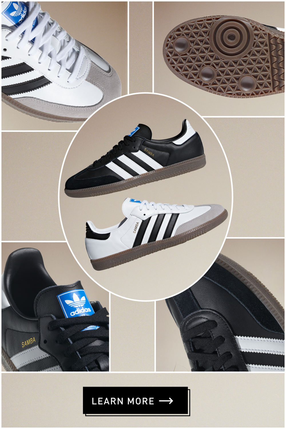 “Born for the world of soccer, the adidas Samba was made for better grip on flat, hard surfaces. The Samba is still a top choice for indoor soccer games, and now different styles of the Samba reign in cycling, on the golf course, and in streetwear. Through its many forms, the Samba is universally recognizable with a suede T-Toe design for that authentic Samba look and a textured rubber cupsole inspired by soccer heritage. ”